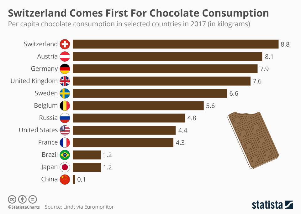 Reports state that Argentina’s chocolate consumption is very similar to Brazil’s. This means that in comparison to the rest of the world, Argentina consumes very little chocolate. Since 2012, their imports of chocolate have dropped significantly.